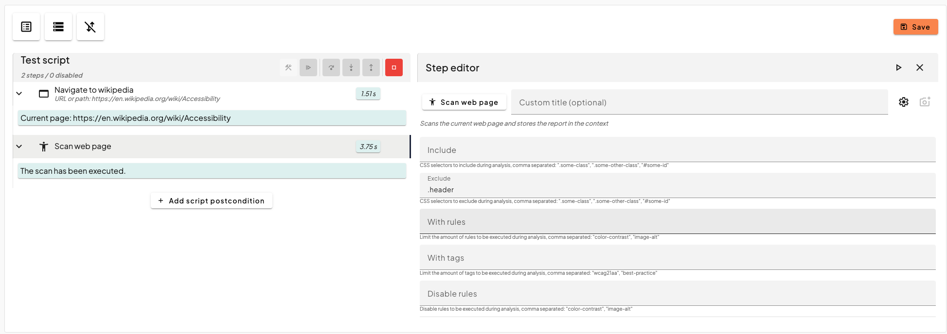| Exclude | Specify CSS selectors to exclude from the scan | .advertisement, .popup |