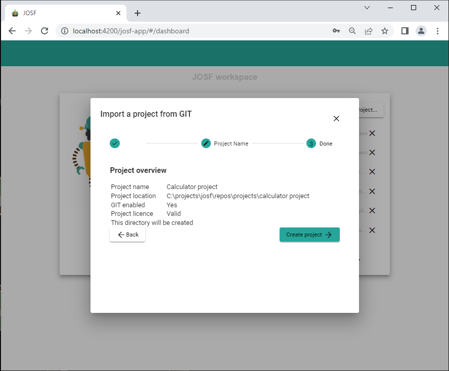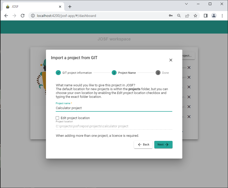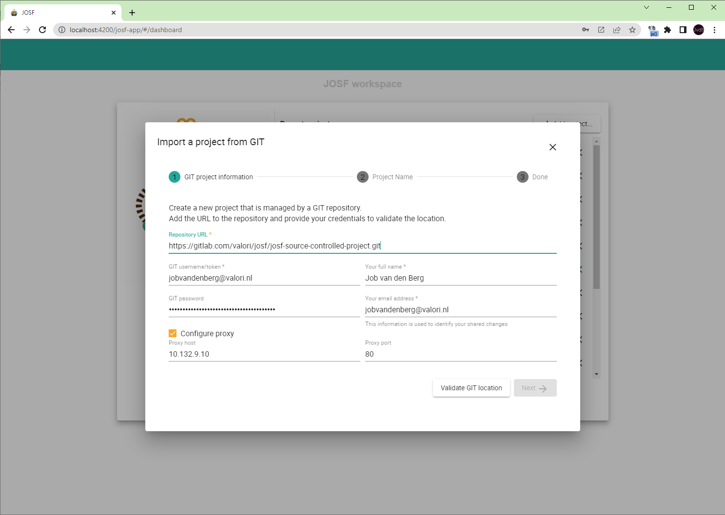 From the workspace overview – when no project is opened yet – you can add a new project from GIT. This requires you to provide the HTTPS URL from the GIT location and your credentials. If you are working behind a proxy, you can enter these after enabling Configure proxy. Next, you can name the new project and JOSF imports the project into your workspace. Note that this does require a valid licence key.