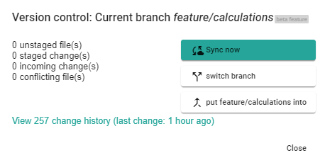 This view contains the current branch, a more detailed view of the current synchronization state and ways to synchronize your changes. Next to that, you can view the change history.