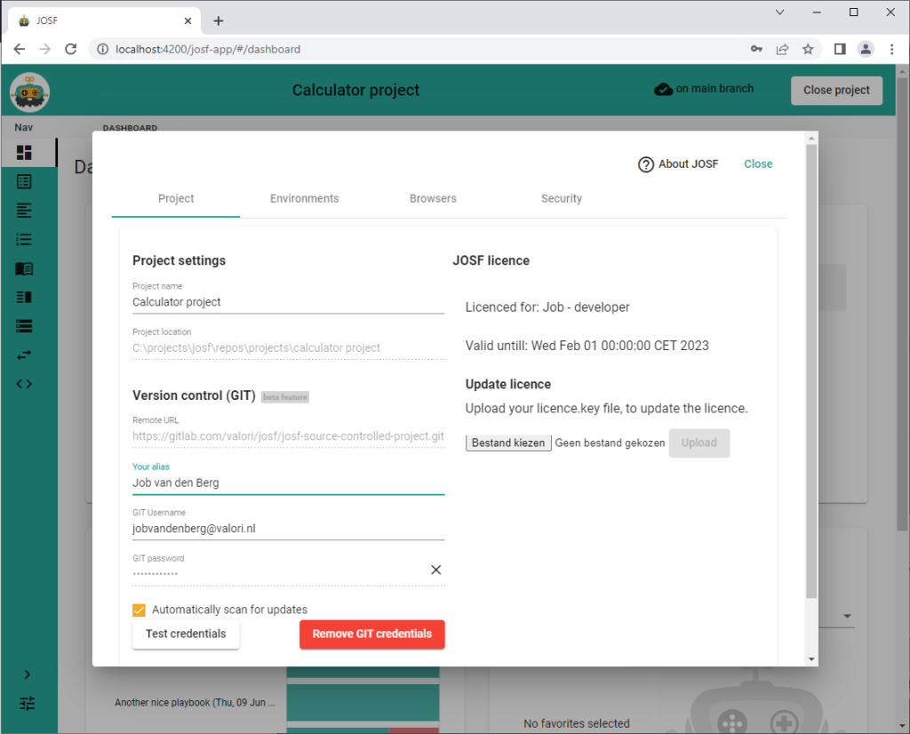 When using JOSF in your team, sharing your test cases should be as easy as a press of a button and with JOSF it is! This is all based on a native implementation of Git and is present as beta feature. If you run into any trouble using this feature, or you have any suggestion, please contact us using our contact form.