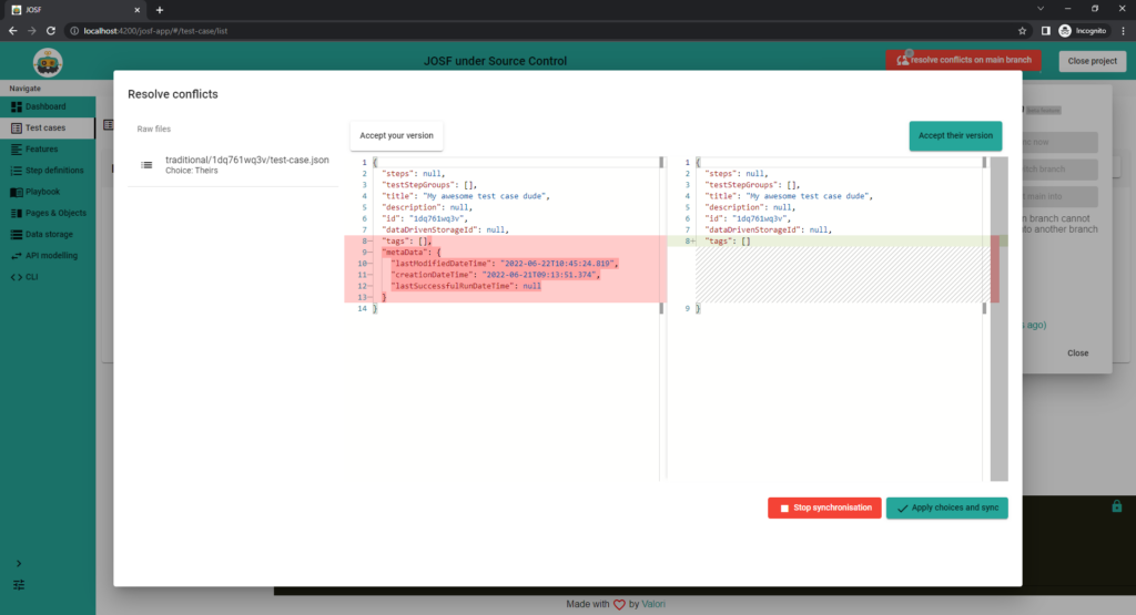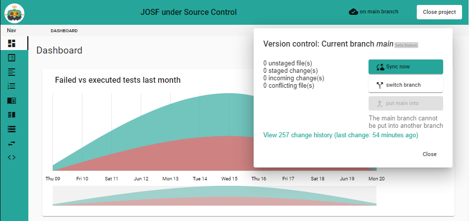 When you create, modify or delete any data in JOSF (test cases, page objects, features, etc.), JOSF sees this as uncommitted changes. These changes are only present in your local JOSF project. To share these with your team, you can synchronize your changes. JOSF synchronization works with branches and by default, the main branch is activated.