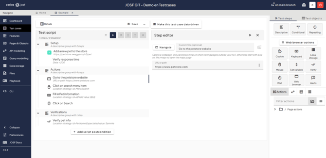 The quick drawer is your tool to create your test cases, page actions or step definitions. It holds every action that JOSF can execute, including your own page actions, API requests and data storages. This enables you to drag your steps and page actions into your test case or to structure it by adding groups.