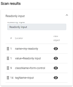 Each Scan result will preview the found object, and presents the possible location strategies, accompanied by the number of found elements when using that strategy (lower is better). Press the eye-icon to highlight the element using that strategy.