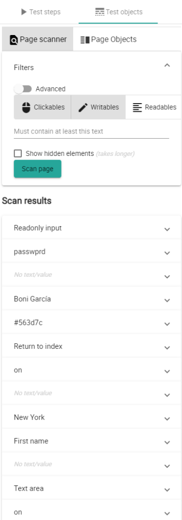 The page scanner is capable of scanning the current web browser, opened by JOSF. You can filter on object types like Clickables, Writables or Readables or toggle on the advances mode and filter on specific HTML elements.