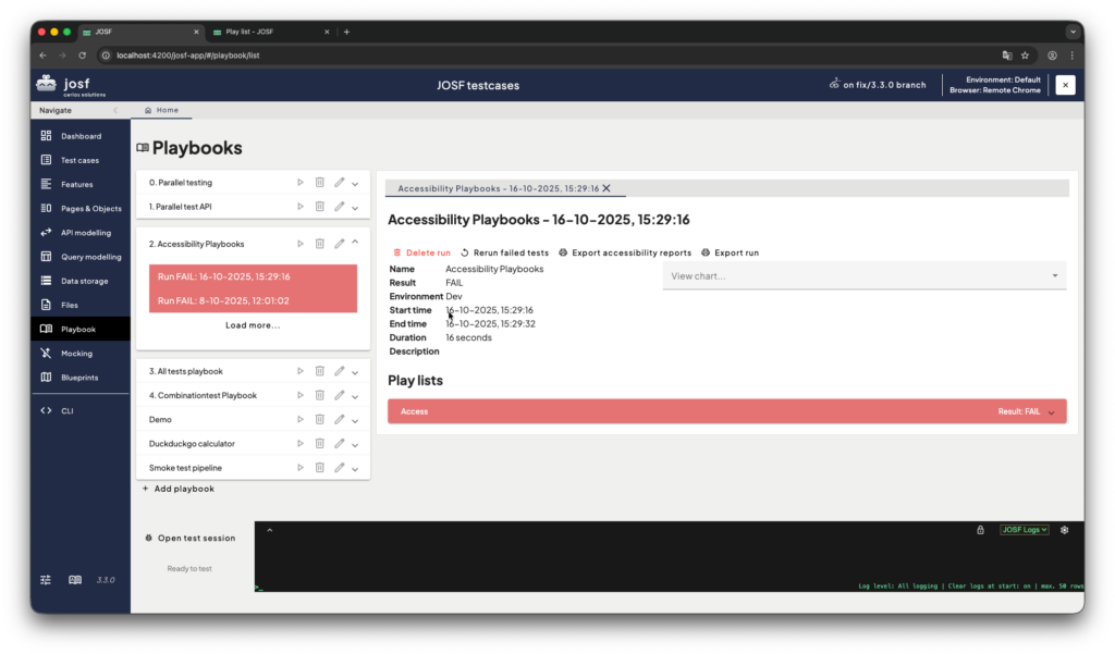 Each playlist has its own tag filters and parallelization settings. - When the playbook starts, JOSF automatically collects all test cases and scenarios that match the playlist’s tag rules.