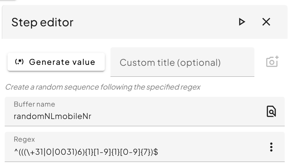 The Regex function creates random data from a regex expression and stores it in the given buffer name.