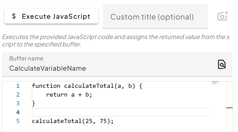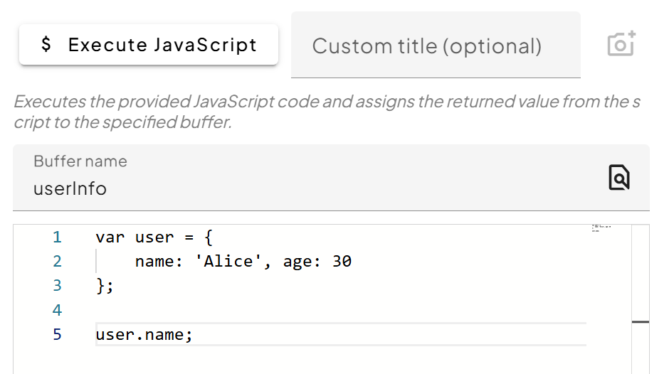 JOSF offers a freshly built renewed "Execute JavaScript" action that allows users to run JavaScript code directly during their test execution. This is an invaluable feature for dynamically generating data, performing calculations, or manipulating objects within your test flow. Now without even starting your the test browser. The returned value from the javascript will be stored in the given buffer name.